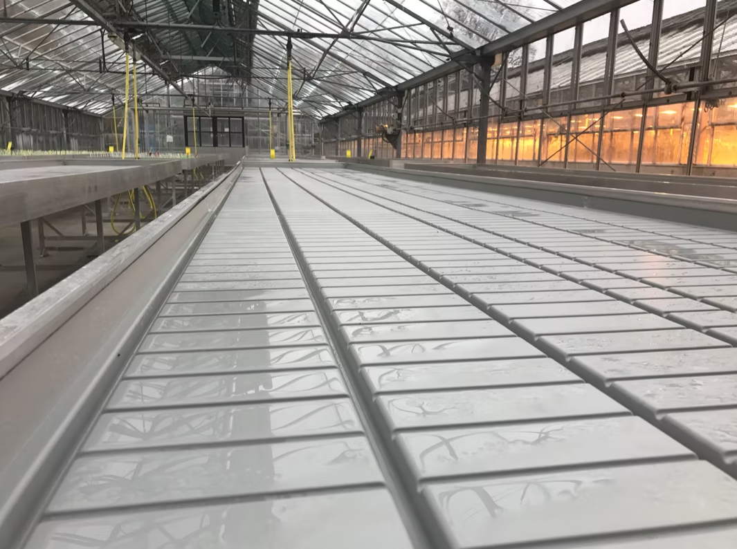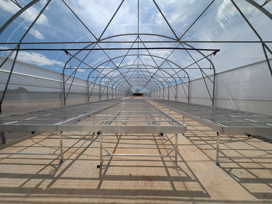Benches with fine mesh tops and integrated irrigation are best for seed propagation. We provide custom benching systems designed for optimal germination and seedling care.