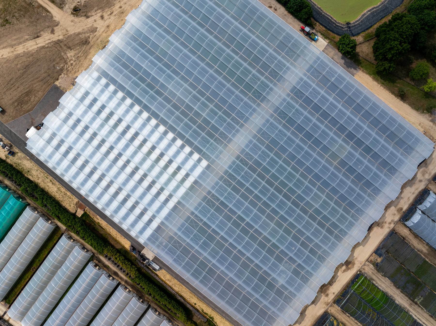 Within the structure, we installed an overhead sprinkler system, and a sand bed trickle irrigation setup along with 1,990m² of horizontal shade screening