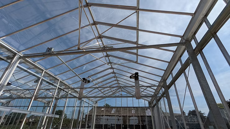 The Venlo-style glasshouse was directly connected to an existing brick laboratory building. The structure comprises two zones: one measuring 4.0m by 8.0m, and the other 8.0m by 8.0m with a post height of 3.0m. Each zone features 3 pane vents on alternate sides of the ridge controlled by Ridder drive units, ensuring effective ventilation. A sliding partition door allows internal access between the two zones, supporting flexible use for different research functions. To maintain architectural continuity, a perimeter brick wall was constructed to visually match the adjacent lab building.