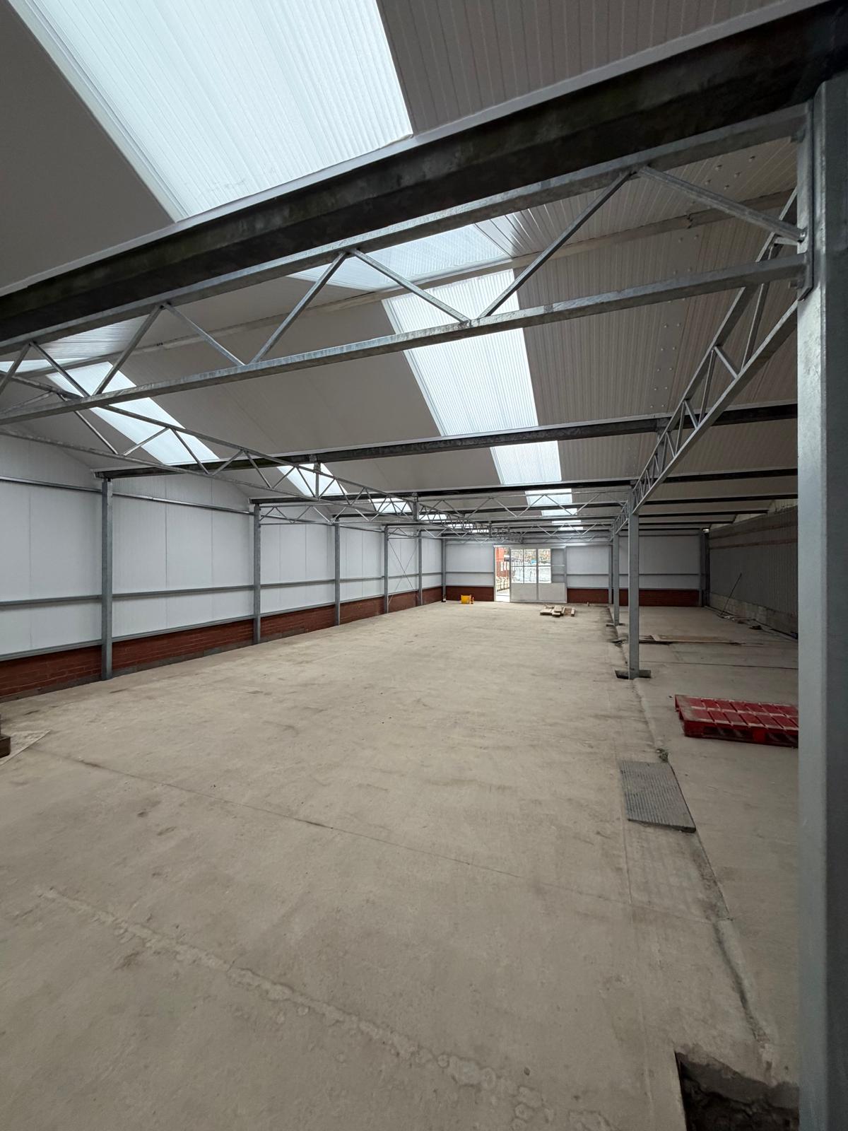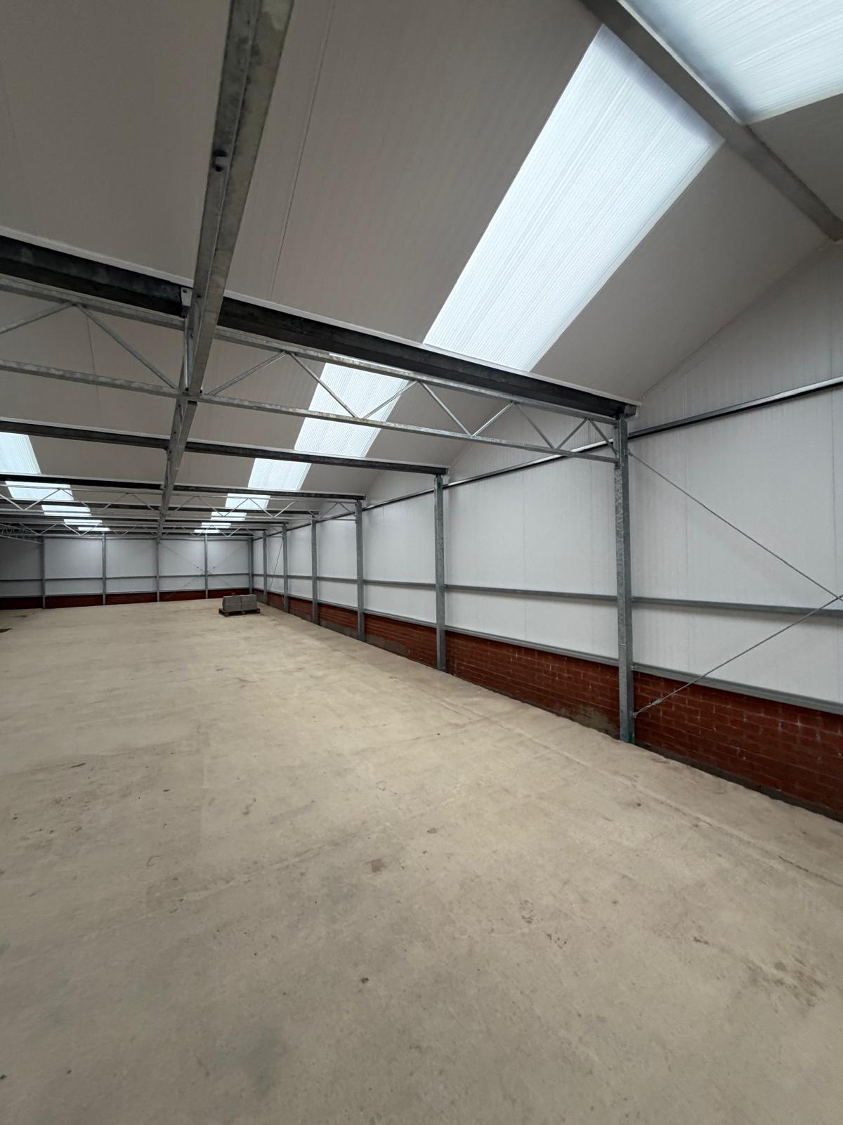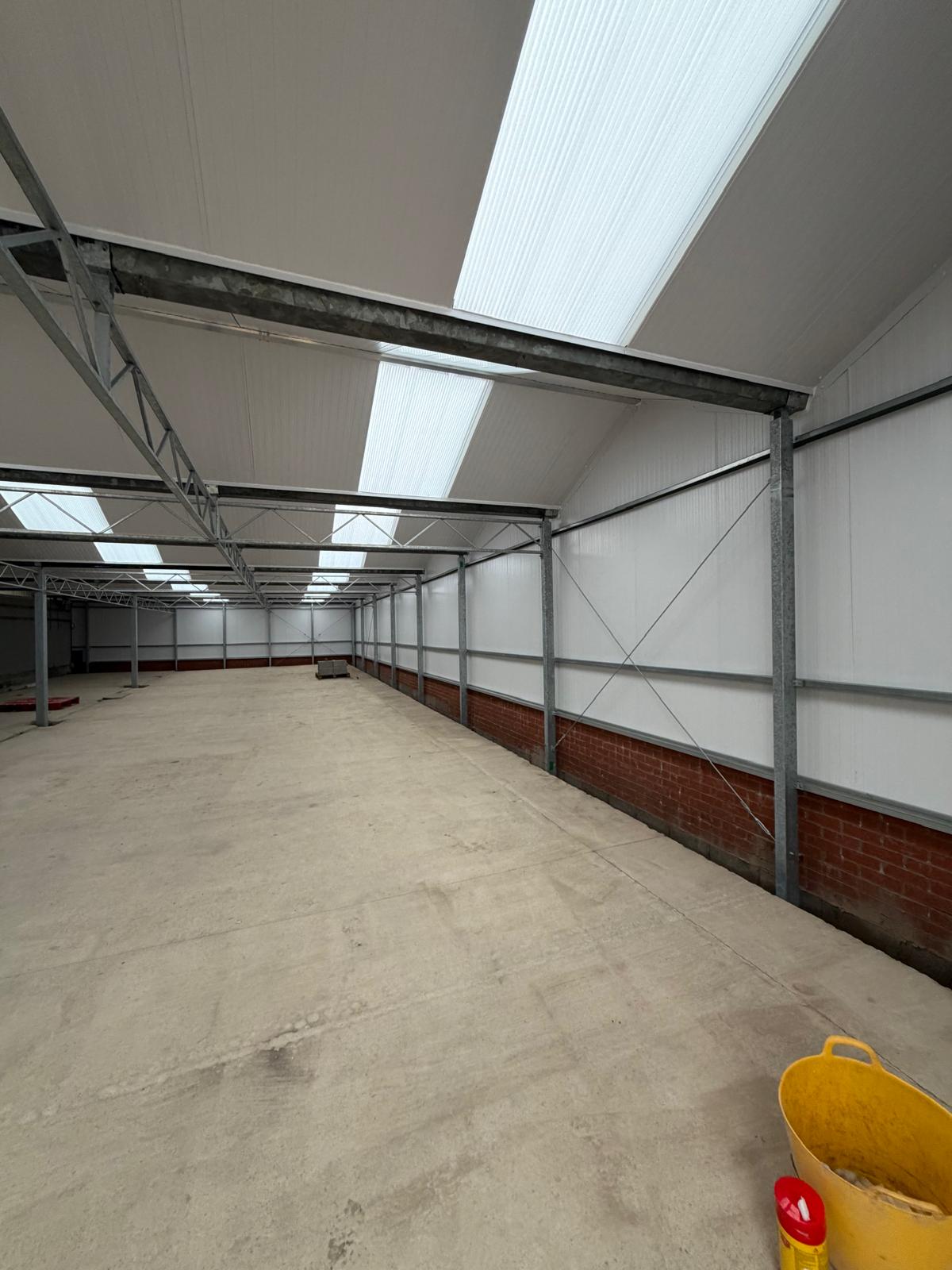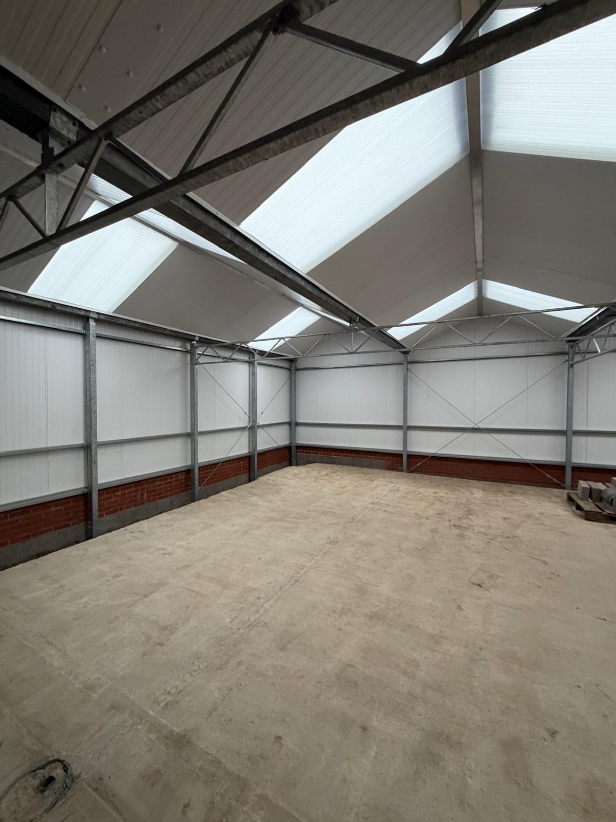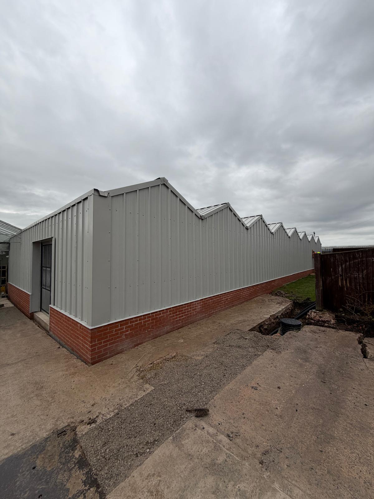 Roof and sides 40mm insulated panels, clear roof lights and perimeter brick wall