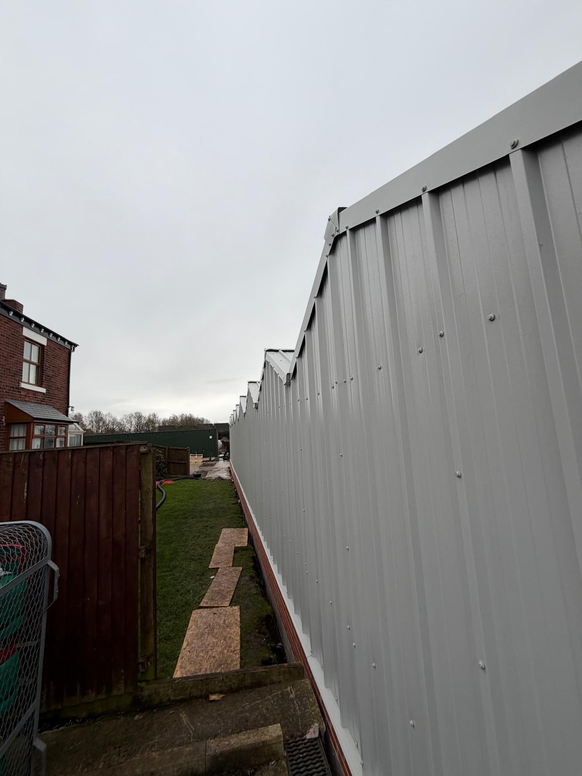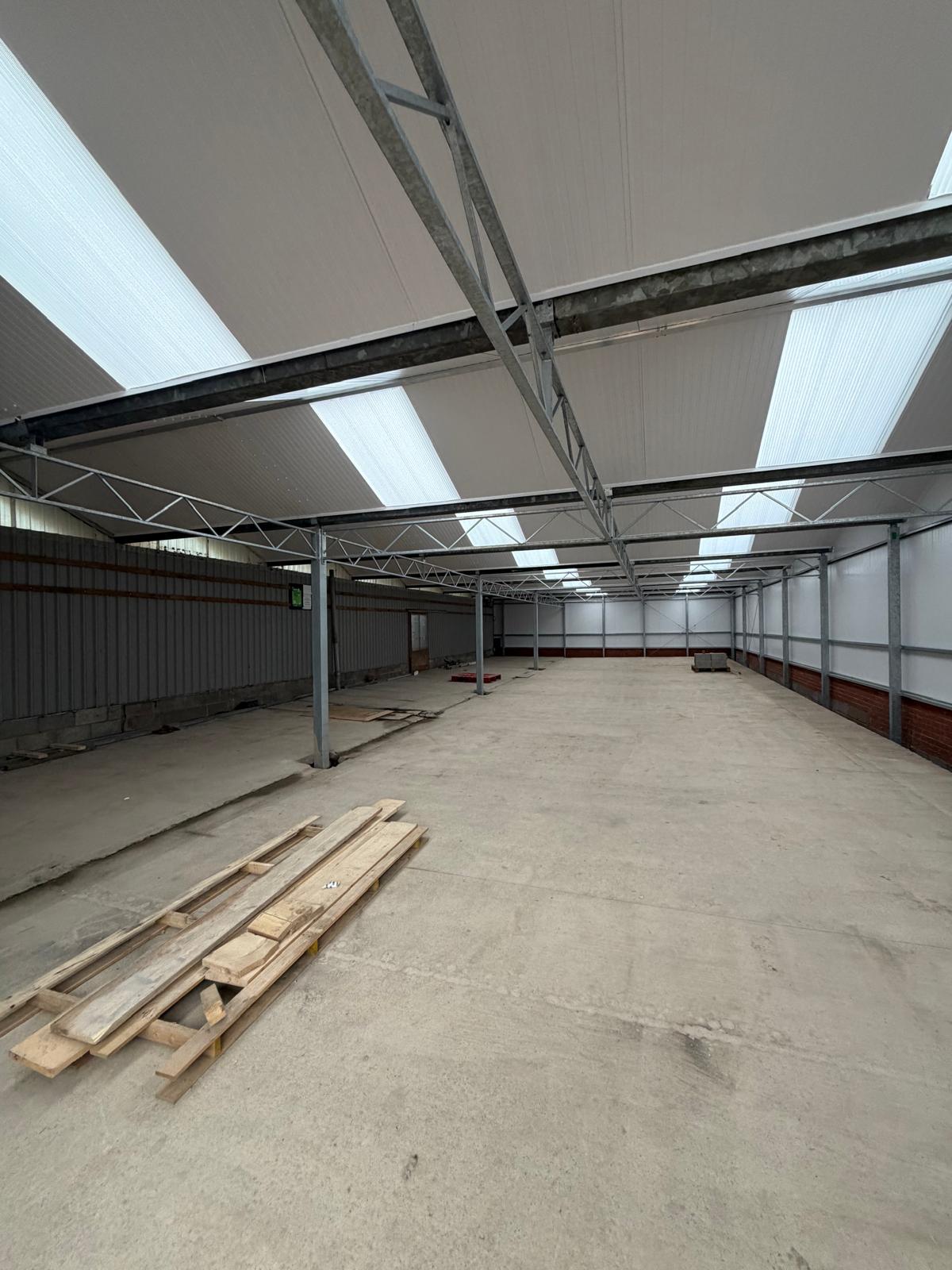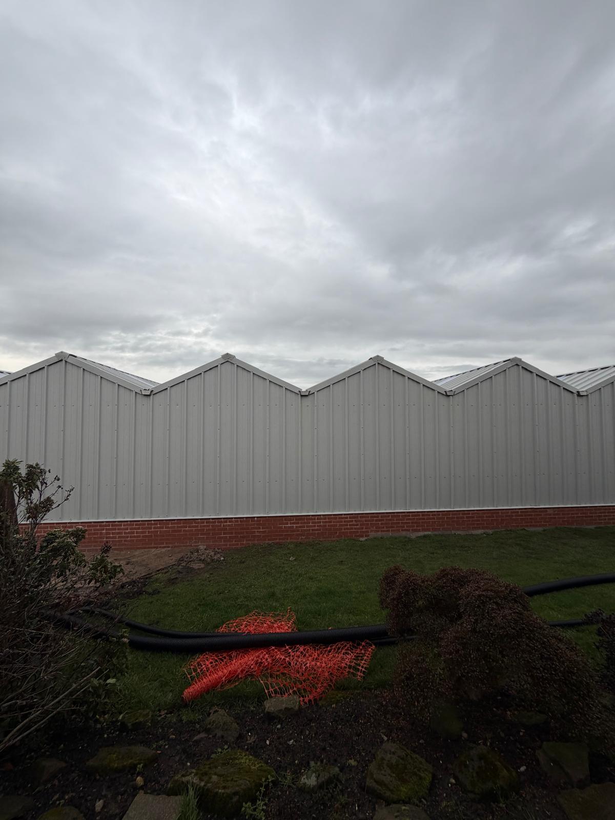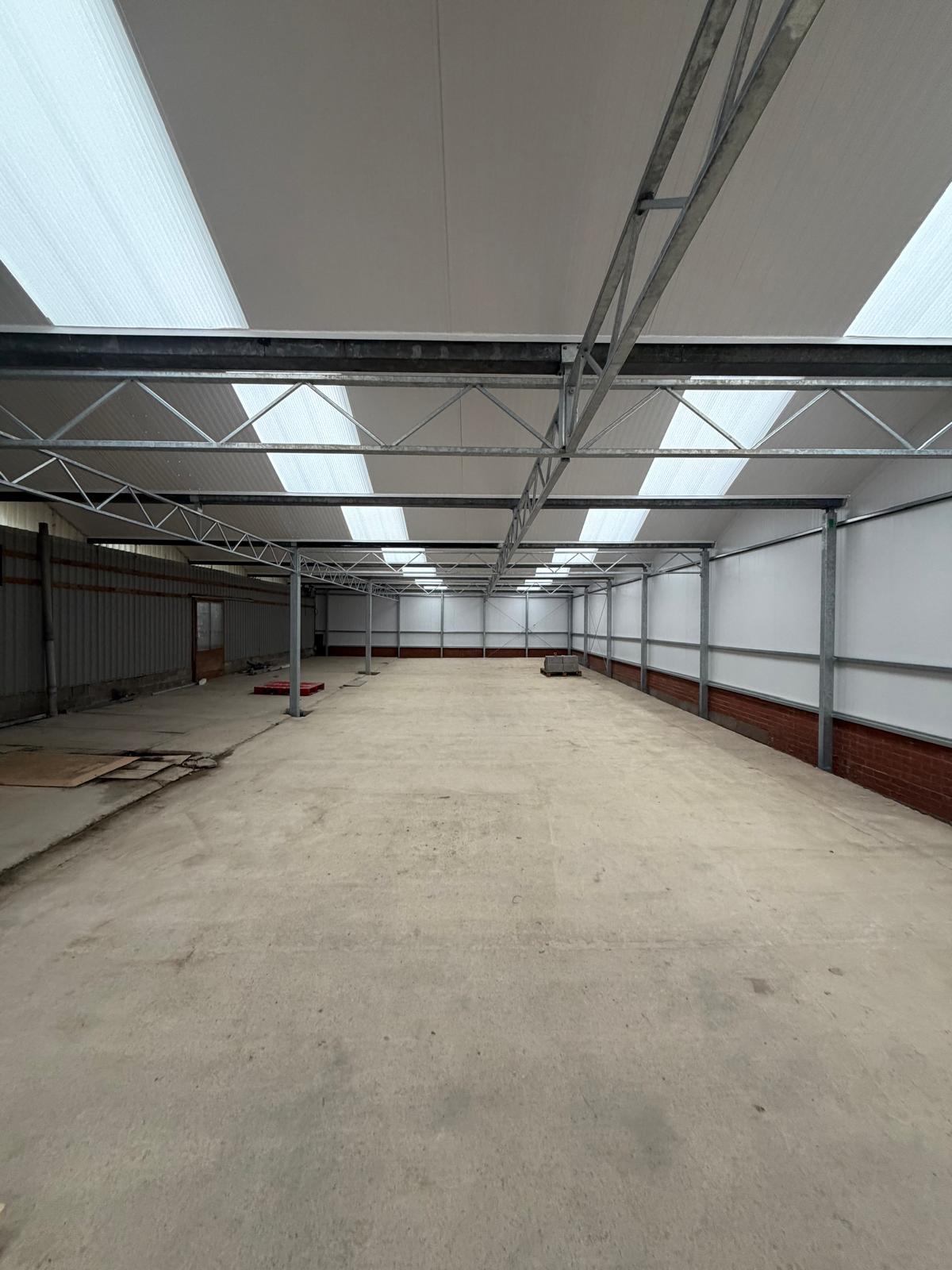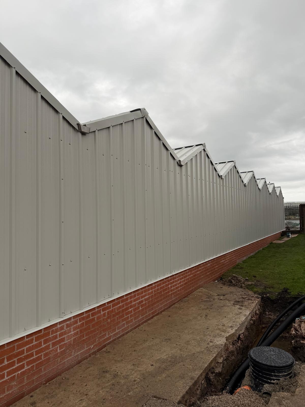 Roof and sides 40mm insulated panels, clear roof lights and perimeter brick wall